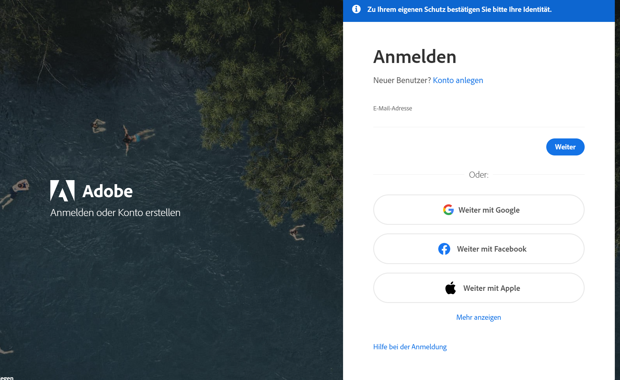 Gehe zu 👉 Adobe-Konto und melde dich mit deiner Schulmailadresse an. Klicke auf "Mehr anzeigen" und danach auf "Weiter mit microsoft"