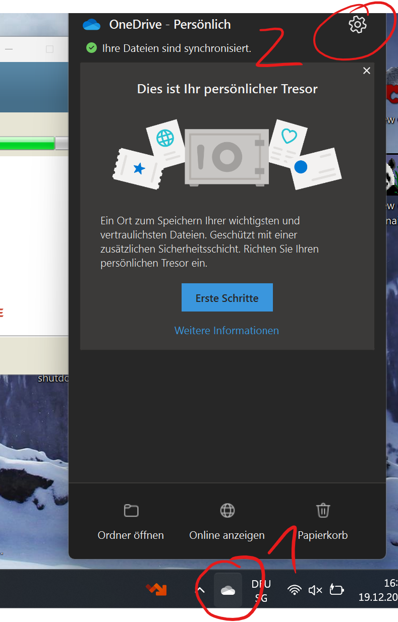 Auf der Taskleiste findest du die "Onedrive-Wolke" (1), entweder unten (Windows) oder oben (Mac).