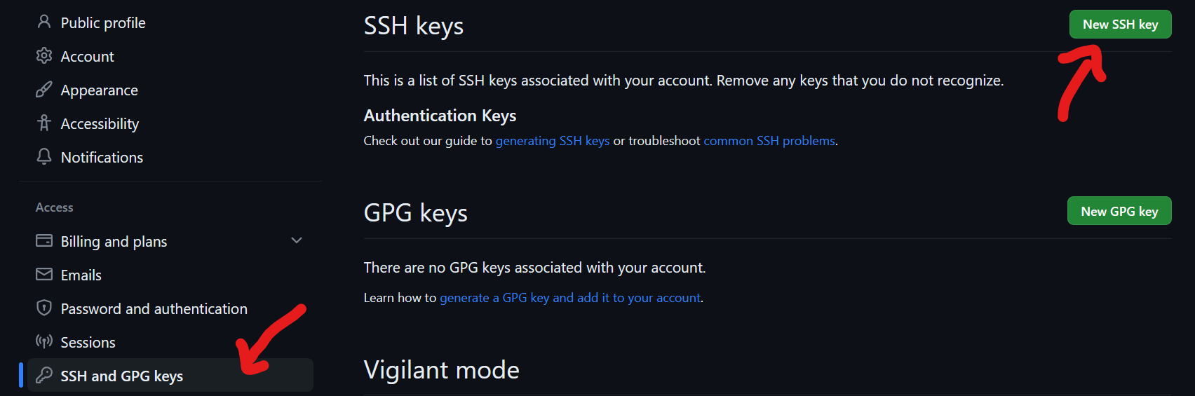 1. Settings > Access > SSH and GPG keys