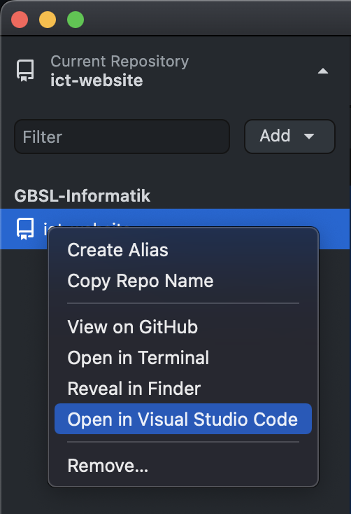 In GitHub Desktop das Projekt 👉 ict-website synchronisieren, indem die URL angegeben wird: