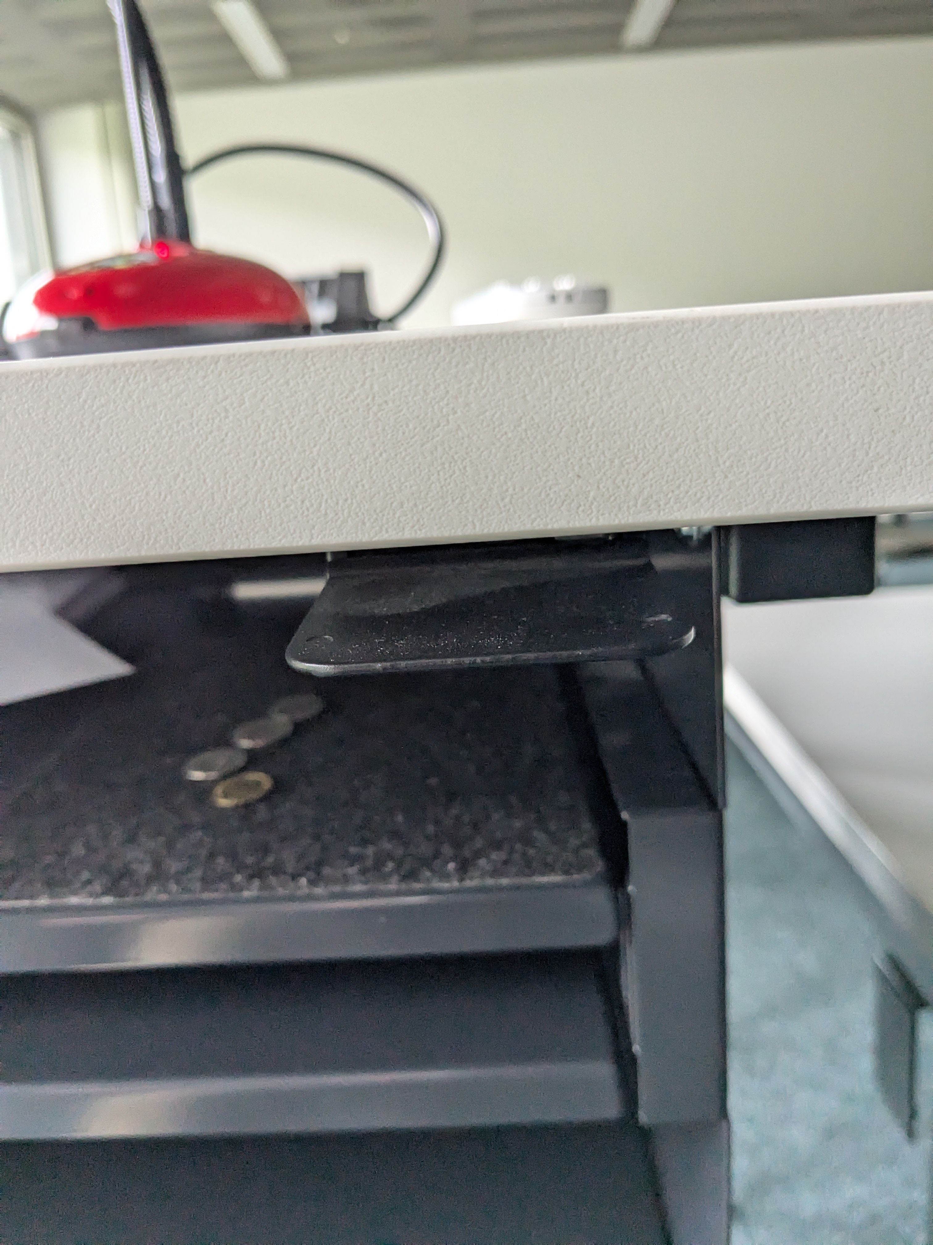 Der Metallhebel für die Höhenverstellung befindet sich rechts unter der Tischflächenach. Nach oben drücken, gleichzeitig Tischfläche nach unten oder oben drücken.