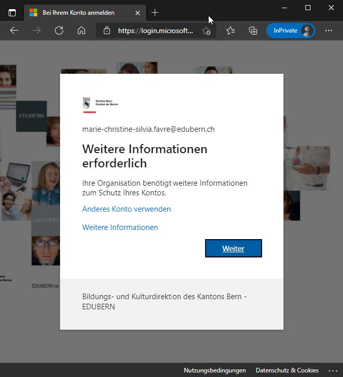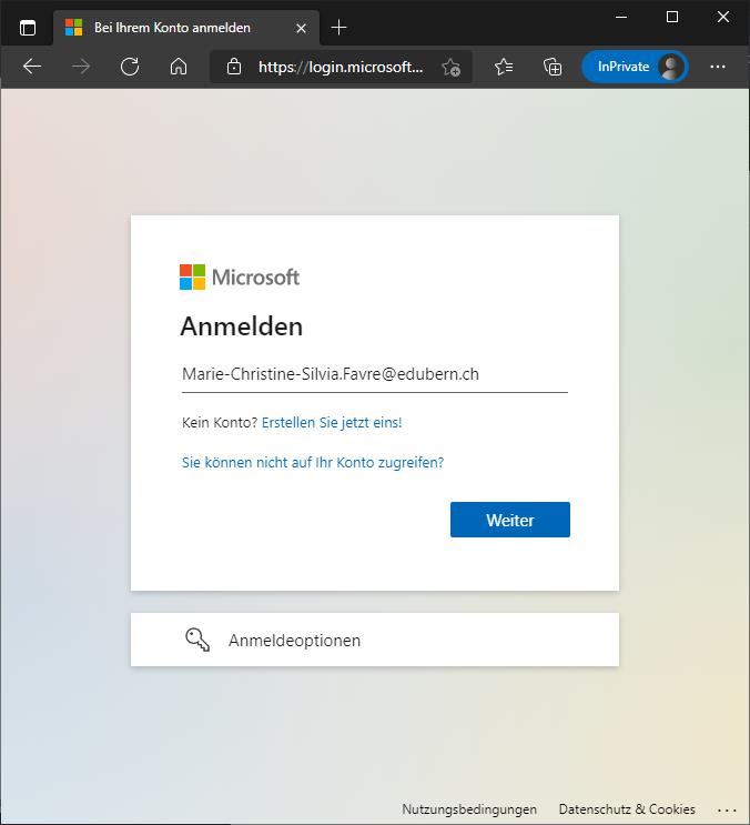 Es erscheint die Aufforderung zur Eingabe der E-Mail-Adresse (Benutzernamen). E-Mail-Adresse eingeben und mit [Weiter] bestätigen.