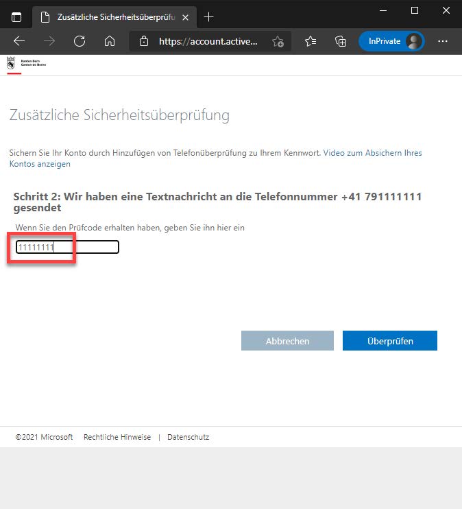 Die Methode [Authentifizierungstelefon], das Land des Providers, die Mobiltelefonnummer und die Auswahl [Code per SMS an mich senden] anwählen. Eingaben mit [Weiter] bestätigen.