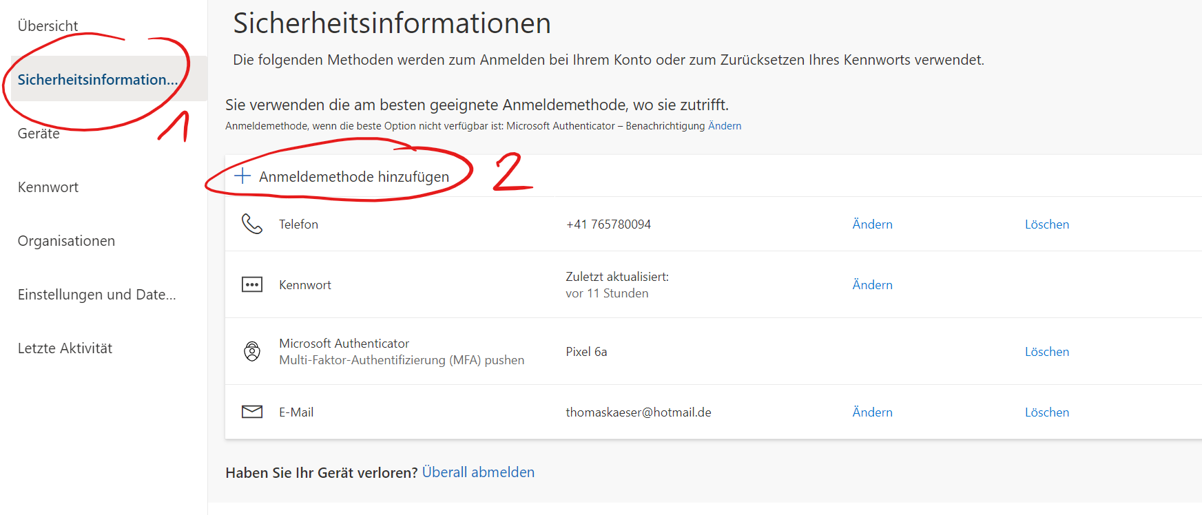 Wähle Sicherheitsinformationen und Anmeldemethode hinzufügen