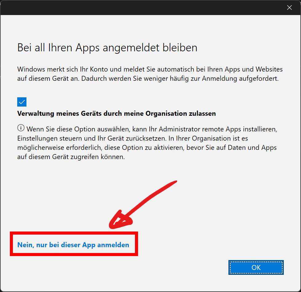 Versuche dich bei einer App anzumelden, wenn folgende Box angezeigt wird, Häkchen deaktivieren und markierte Variante anklicken: